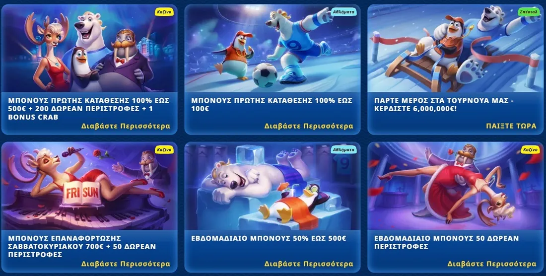 - Επαναφόρτωση μπόνους Σαββατοκύριακου - Προσφέρει 50% έως 700 ευρώ και 50 δωρεάν περιστροφές για ελάχιστη κατάθεση 50€. Διαθέσιμο κάθε εβδομάδα από Παρασκευή έως Κυριακή. Για να απελευθερώσετε το μπόνους, στοιχηματίστε το 35 φορές. Τα κέρδη από δωρεάν περιστροφές απαιτούν στοίχημα 40 φορές.